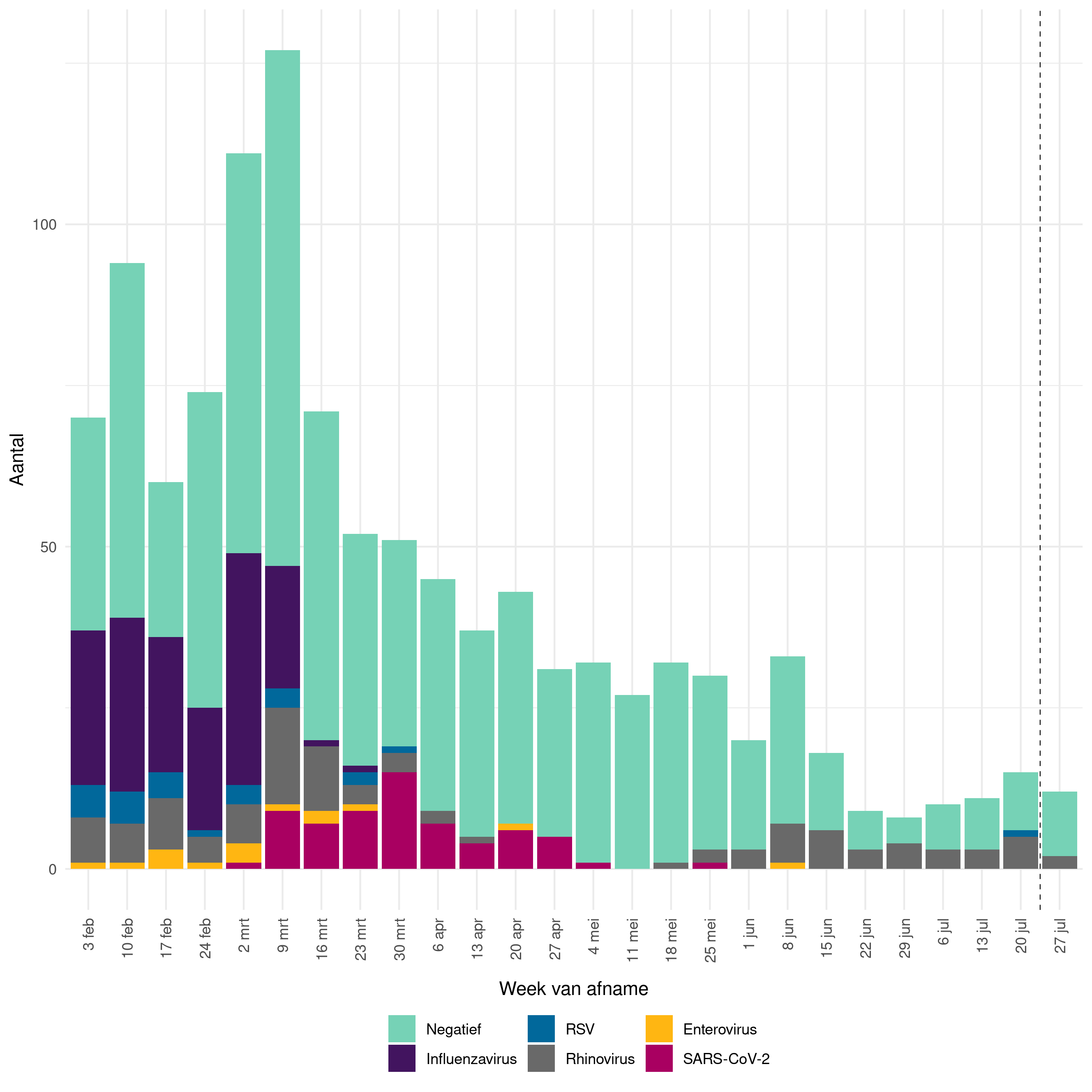 Bij een steekproef onder personen die met griepachtige klachten of andere acute luchtweg klachten naar een huisarts gaan worden monsters afgenomen. Dit wordt uitgevoerd door huisartsen die onderdeel zijn van de Peilstations van NIVEL (Nederlands Instituut voor Onderzoek van de Gezondheidszorg) Zorgregistraties eerste lijn. Die monsters worden op het RIVM op vijf virussen getest; het influenzavirus, het RS-virus (Respiratoir Syncytieel-virus ), het rhinovirus, het enterovirus, en op SARS (severe acute respiratory syndrome)-CoV-2, het nieuwe coronavirus. Van eind januari tot half maart werd het influenzavirus vaak gezien. Van maart tot begin mei werd bij de peilstations bij een positieve test vooral het nieuwe coronavirus aangetroffen. Vanaf 11 mei tot 27 juli was het rhinovirus het vaakst aanwezig in de monsters. (zie figuur 2). Het kan zijn dat er andere virussen aanwezig zijn bij personen met een negatieve testuitslag omdat er slechts op een beperkt aantal virussen getest wordt. Deze rapportage wordt vanaf deze week opgenomen in het epidemiologisch rapport .