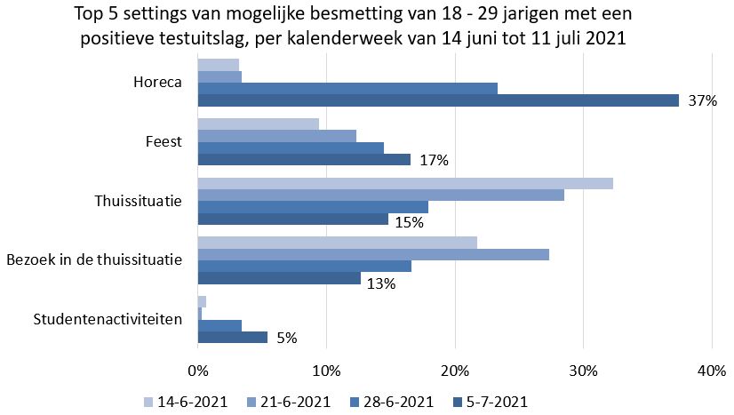 Ongeveer een derde (28%) van de gemelde personen van afgelopen week is de door de geteste personen aangegeven vermoedelijke setting van de besmetting bekend. Afgelopen week werd het grootste deel van de besmettingen door de geteste personen gerelateerd aan de horeca (37%), gevolgd door thuissituatie (28%), bezoek in de thuissituatie (16%), feesten (15%) en werk (7%). Voorheen raakten de meeste mensen besmet in de thuissituatie of tijdens bezoek in de thuissituatie.