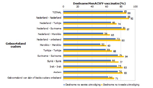 Tijdens een inhaalcampagne in 2018 werden tieners geboren tussen mei en december 2004 uitgenodigd voor een vaccinatie tegen meningokokkenziekte (MenACWY-vaccinatie). Na de eerste uitnodiging was de deelname vooral lager onder tieners waarvan één of beide ouders niet in Nederland werden geboren. De deelname was het laagst wanneer ouders uit Marokko (beide ouders: 52%, één ouder: 56%) of Turkije (beide ouders: 59%, één ouder 66%) kwamen (zie Figuur).