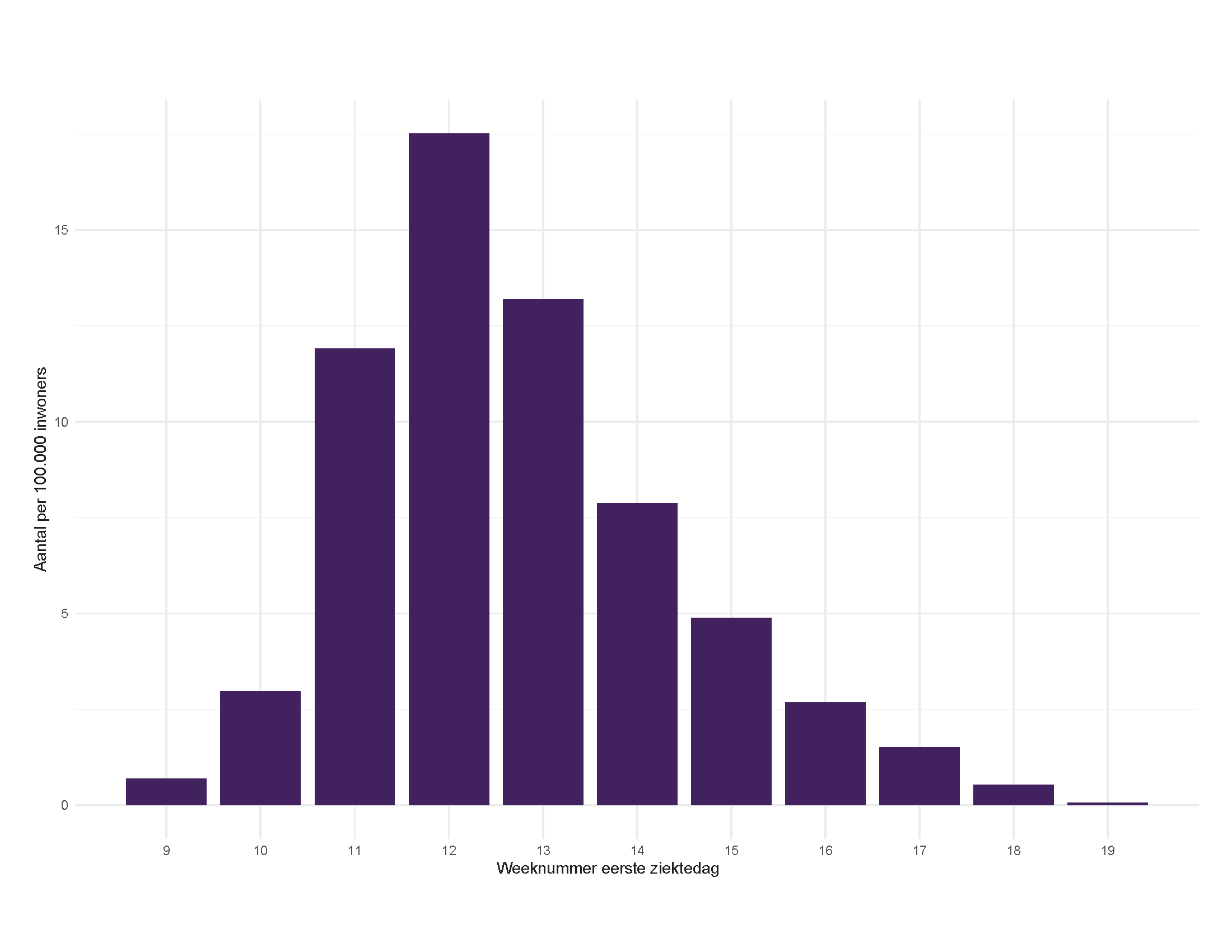 Het hoogste aantal gemelde COVID-19 patiënten werd ziek in de week van 16 tot en met 22 maart (week 12). In grafiek 1 en 2 is vanaf week 13, zowel landelijk als in alle provincies een daling te zien in het aantal gemelde COVID-19 ziekenhuisopnames per 100.000 inwoners. Dit wijst erop dat de landelijke maatregelen effectief geweest zijn om de COVID-19 epidemie in te dammen.