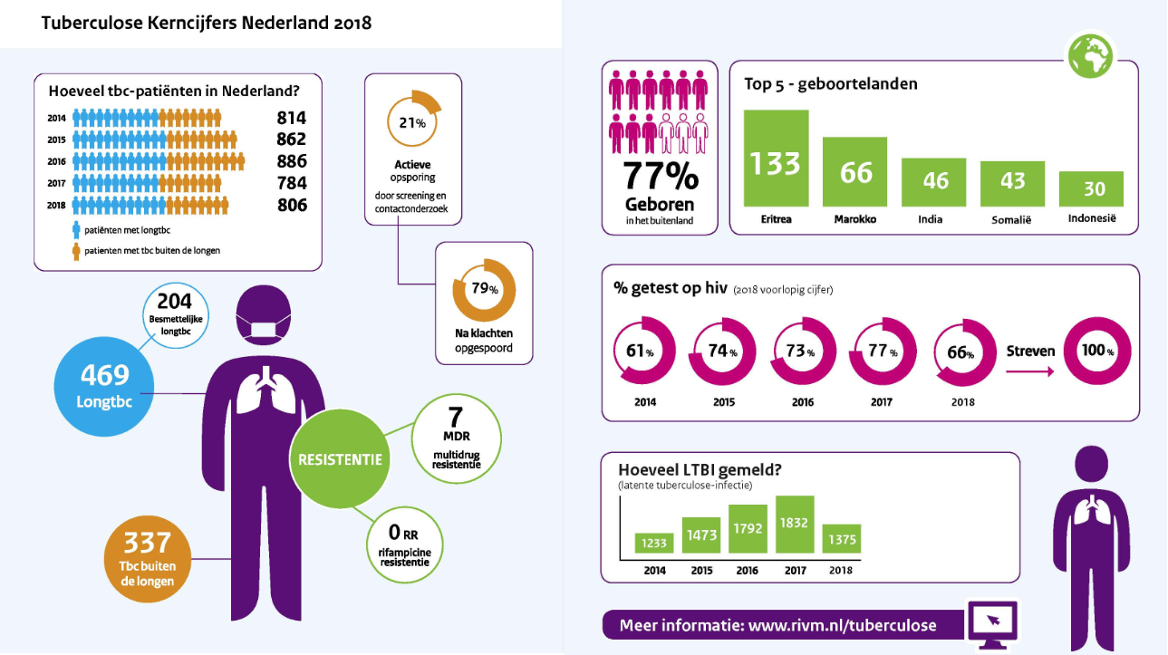 Het grootste deel van de Nederlandse tbc-patiënten komt uit landen waar tuberculose veel voorkomt. In 2018 komt de grootste groep tbc-patiënten uit Eritrea. De behandeling van tbc bestaat uit een combinatie van verschillende soorten antibiotica. Bij zeven patiënten kwam een ernstige vorm van resistentie tegen antibiotica voor.