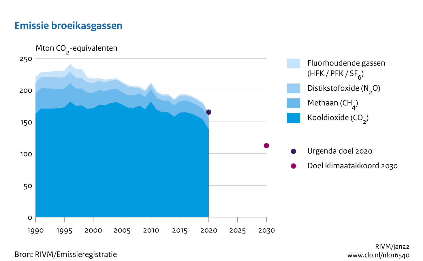 Broeikasgassen zoals koolstofdioxide (CO2), methaan, lachgas en zogenoemde F-gassen, zorgen voor de opwarming van de aarde. In 2020 was de uitstoot in Nederland 164,3 megaton CO2 (carbon dioxide)-equivalenten. Dat is 15,9 megaton (8,8 procent) minder dan in 2019. De uitstoot van broeikasgassen geven we weer in megaton (is miljard kilo) CO2-equivalenten. Tussen 1990 en 2017 vond de emissiedaling voor het overgrote deel plaats bij de overige broeikasgassen: methaan, lachgas en de F-gassen. De emissie van CO2 bleef in deze periode ruwweg constant, en daalde vanaf 2018.