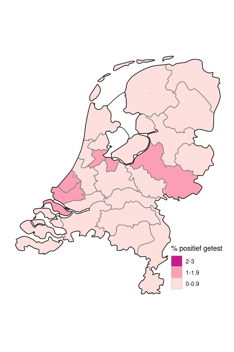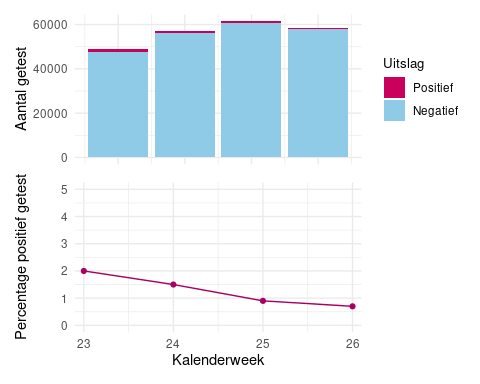 Sinds 1 juni kan iedereen in Nederland met (milde) klachten zich laten testen op COVID-19 in de GGD (Gemeentelijke Gezondheidsdienst) teststraten. Het percentage positieve testen is laag, het daalt van 2% in week 23 naar 0,9% in week 26. Sinds 11 mei mogen kappers, autorijscholen en andere contactberoepen hun werk weer hervatten. Uit de resultaten tot nu toe is 1% van de mensen met een contactberoep die zich hebben laten testen positief voor COVID-19.