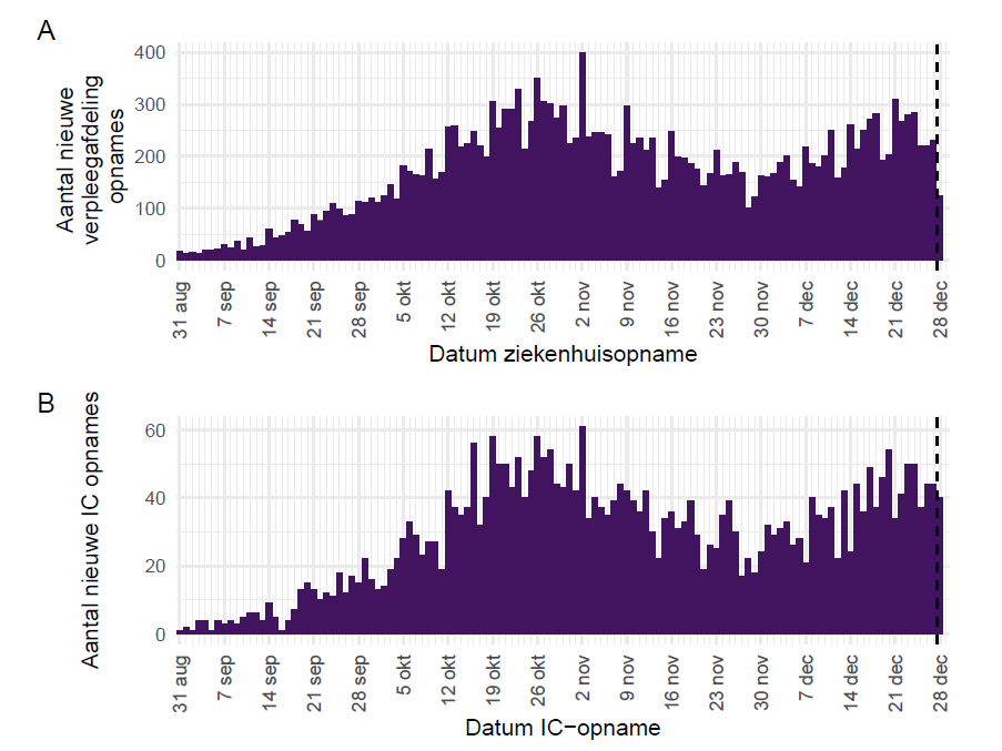 In de week van 21 tot en met 27 december steeg het aantal mensen dat met COVID-19 werd opgenomen op de verpleegafdeling in het ziekenhuis iets minder hard dan in de voorgaande week. Er werden 1.811 patiënten opgenomen, bijna 140 patiënten meer dan in de week daarvoor toen 1.675 mensen werden opgenomen. Het aantal mensen dat zo ziek werd dat zij moesten worden overgeplaatst naar de intensive care nam ook licht toe. In de week van 21 tot 27 december waren 300 nieuwe IC-opnames. In de week ervoor werden 290 nieuwe patiënten op de IC gemeld (figuur 2).