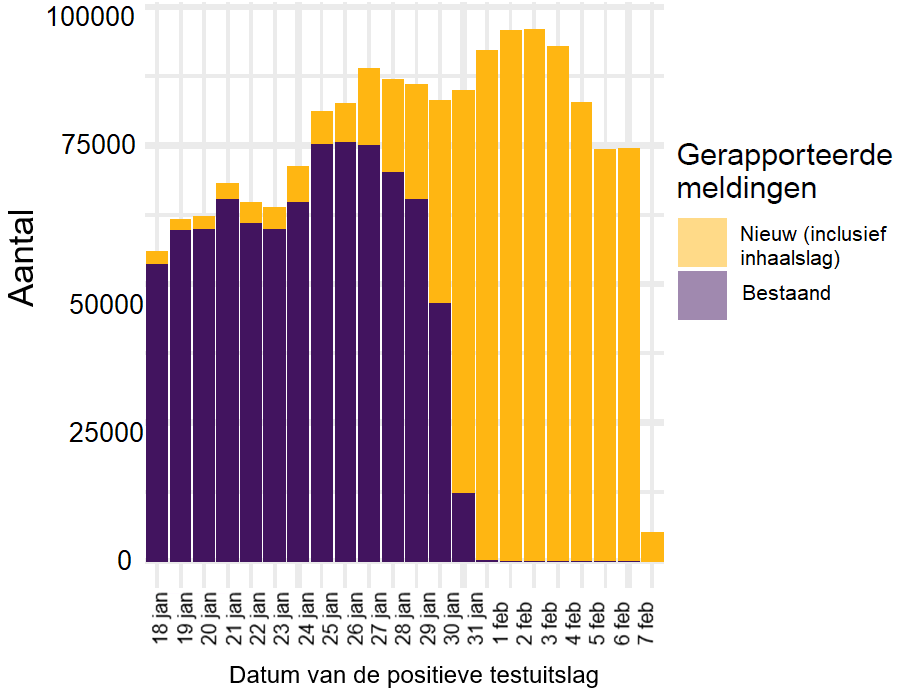 Figuur 1 toont de positieve coronatesten per dag van de testuitslag, waarvan de laatste paar dagen nog aangevuld worden. In geel staan meldingen die deze week (van dinsdag 1 februari 10.00 tot en met dinsdag 8 februari 10.00) nieuw ontvangen zijn op het RIVM en in paars staan de meldingen die voor dinsdag 1 februari 10.00 al bekend waren bij het RIVM. Met de nieuwe meldroute werd vandaag een inhaalslag gemaakt van 317.184 positieve testuitslagen met een datum positieve testuitslag vanaf 18 januari 2022.