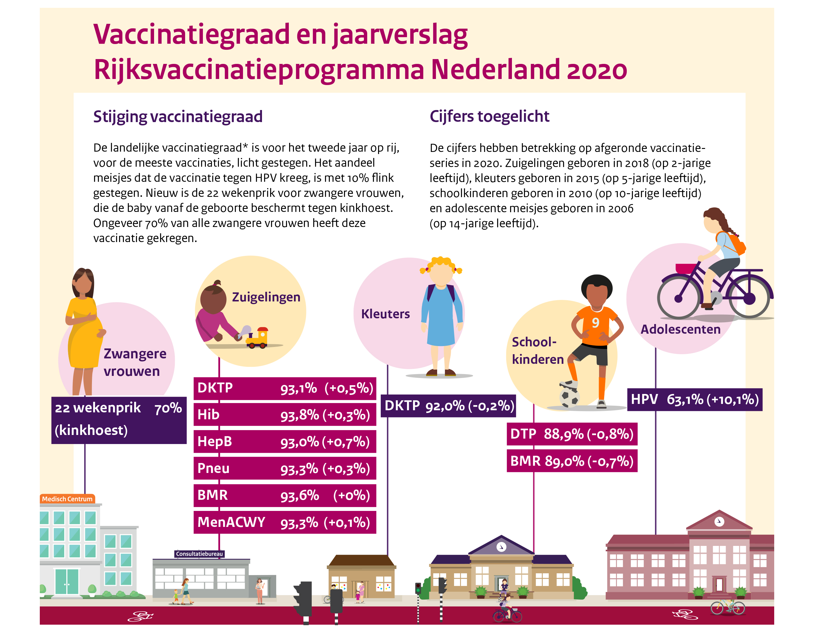 Opnieuw is het aandeel kinderen toegenomen, dat de vaccinaties uit het Rijksvaccinatieprogramma (RVP) krijgt. Daarnaast valt vooral de stijging op bij de HPV (humaan papillomavirus)-vaccinatie met 10 procent naar 63 procent. Deze vaccinatiegraad was niet eerder zo hoog. Daarnaast heeft naar schatting 70% van de zwangeren de 22 wekenprik gehaald om hun baby te beschermen tegen kinkhoest. Dat staat in het rapport Vaccinatiegraad en jaarverslag Rijksvaccinatieprogramma Nederland 2020.