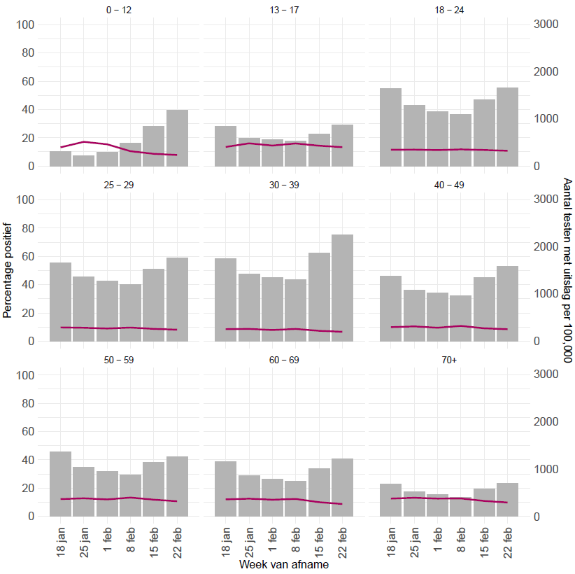 Figuur 1: Aantal testen met uitslag (grijze balkjes) en percentage positief (rode lijn) per leeftijdscategorie per week.