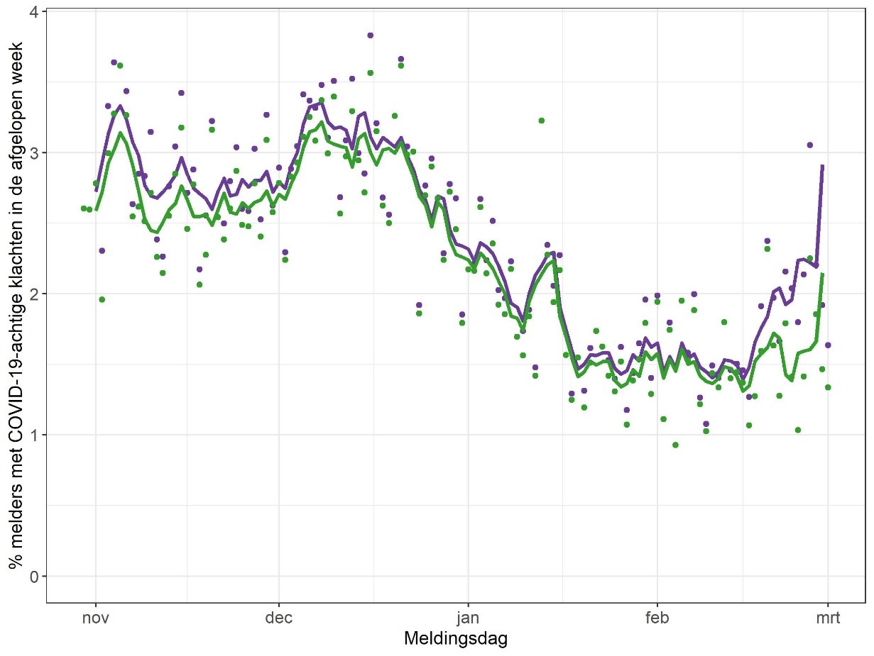 De stippen laten zien hoeveel procent van de deelnemers klachten had die passen bij COVID-19. De lijnen tonen dit ook, alleen dan de gemiddeldes per 5 dagen.
