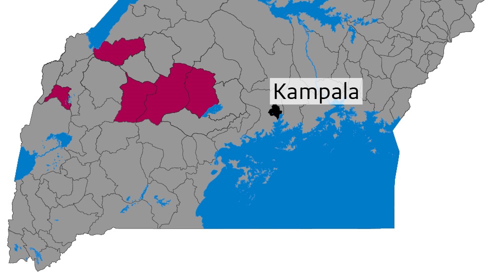 Regio’s in Oeganda waar ebola is vastgesteld bij mensen.