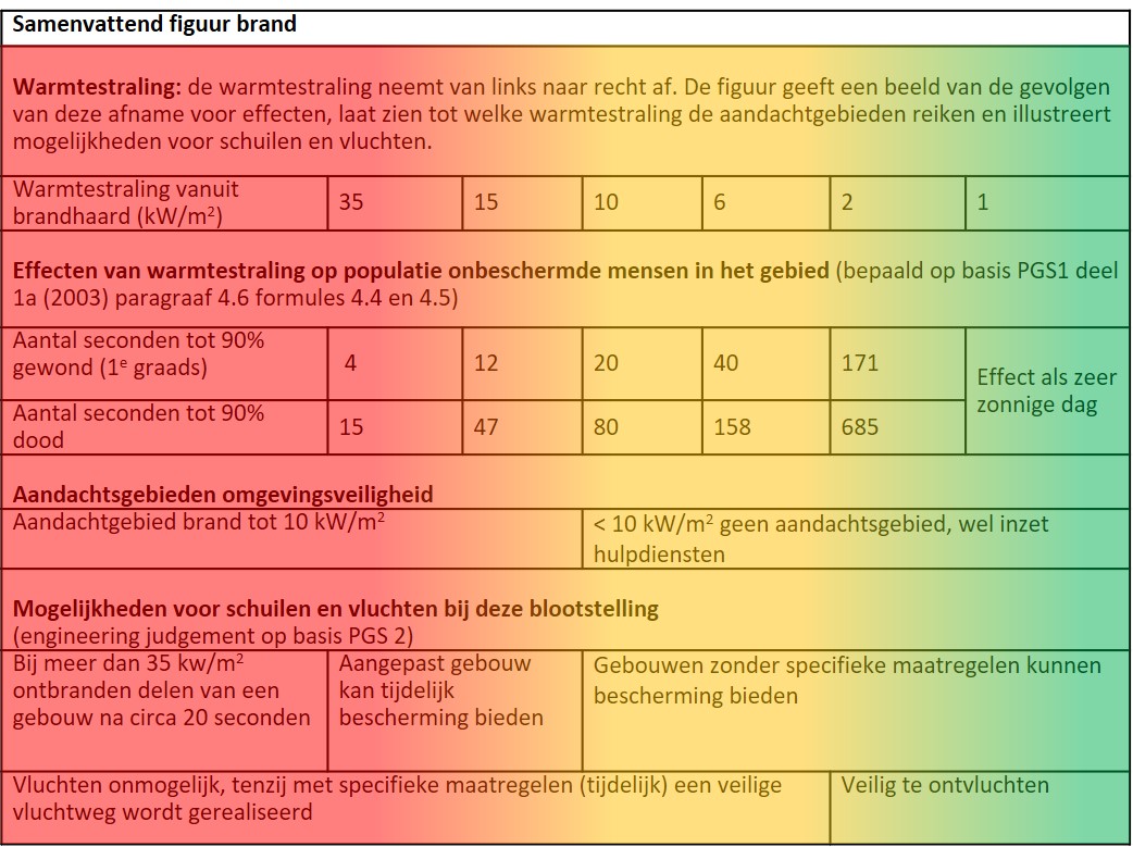 Ook buiten het aandachtsgebied kan brand nog gevaarlijk zijn voor mensen. Een warmtestraling van 3 kW/m2 (pijngrens) is dusdanig dat mensen na 10 seconden bij een onbedekte huid pijn zullen ervaren. Hulpdiensten gebruiken bij een dergelijke warmtestraling beschermende kleding. Beneden de 3 kW/m2 is vluchten zonder beschermende kleding veelal nog mogelijk. Een warmtestraling van 1 kW/m2 is te vergelijken met de warmtestraling op een zeer zonnige dag.