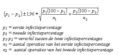 Onderstaande formule (Wilson’s formule) geeft een simpele manier om handmatig een 95%-betrouwbaarheidsinterval te berekenen, voor zowel prevalentiecijfers als voor het percentage postoperatieve wondinfecties. Uiteraard kan deze formule ook gebruikt worden voor andere percentages en proporties, bijv. (bijvoorbeeld) het percentage centraal veneuze lijnen met totaal parenterale voeding.