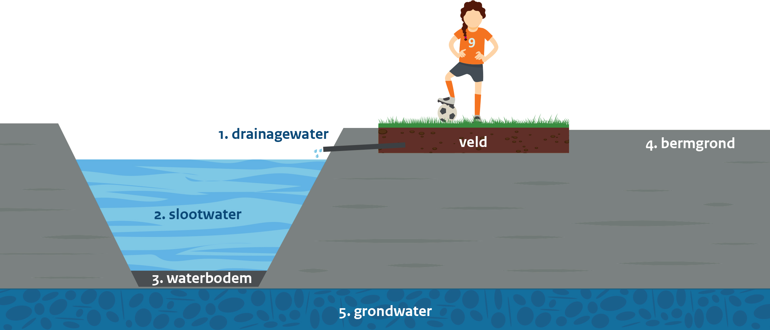 - Slootwater en grondwater in de natuurlijke ondergrond zijn niet verontreinigd door het rubbergranulaat op de velden. Dit water kan naar verwachting zonder bezwaar gebruikt worden, bijvoorbeeld om moestuinen mee te besproeien.
