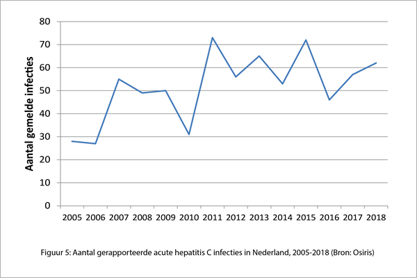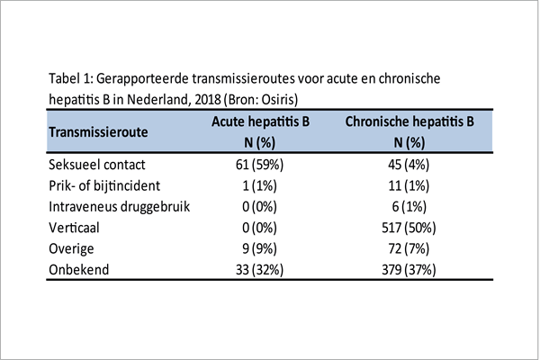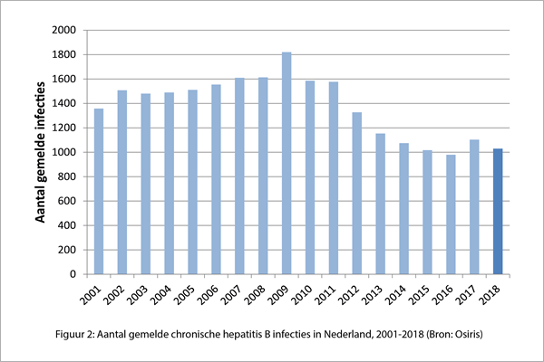 | Hepatitis jaaroverzicht Deze nieuwsbrief is verstuurd naar de afdelingen infectieziekten van de GGD en naar de contactpersonen bij de laboratoria. Wij willen u vragen de nieuwsbrief door te sturen naar degenen binnen uw organisatie die zich bezig houden met hepatitis B en C. U kunt zich aanmelden voor de nieuwsbrief via abonneren.rivm.nl. Afmelden kan via de link onderaan deze nieuwsbrief. | | | Dit jaaroverzicht is gebaseerd op informatie die bij RIVM beschikbaar is uit de volgende bronnen: - Wettelijke meldingen van nieuwe hepatitis B en C virus infecties (OSIRIS), inclusief de moleculaire surveillance van acute hepatitis B virus infecties - Bevolkingsonderzoek zwangeren (PSIE: Prenatale Screening infectieziekten en Erytrocytenimmunisatie) - Rijksvaccinatieprogramma (RVP) - HBV vaccinatieprogramma voor risicogroepen | Introductie meldingsplicht chronische hepatitis C | | Per 1 januari 2019 is de meldingsplicht voor hepatitis C veranderd. Naast acute hepatitis C zijn nu ook chronische infectie en herinfectie met hepatitis C-virus meldingsplichtig voor behandelend artsen en hoofden van microbiologische laboratoria. Hiertoe is besloten omdat er sinds 2015 een nieuwe effectieve behandelmethode voor chronische HCV is die ook vanuit het basispakket vergoed wordt. Deze behandelmethode draagt bij aan de genezing en het voorkomen van chronische HCV. Het heeft daarmee meerwaarde om alle geïnfecteerde personen tijdig in beeld te krijgen en te behandelen om zo verdere verspreiding te voorkomen. De huidige meldingsplicht voor alleen acute HCV-infecties voorziet hierin onvoldoende. De GGD kan in geval van een brede meldingsplicht de contact- en bronopsporing uitvoeren, alsook de begeleiding van patiënten naar de tweede lijn. De meldingsplicht houdt in dat alle personen die voldoen aan de meldingscriteria voor een recente primo HCV-infectie, een chronische HCV-infectie/infectie met onbekende duur of een HCV-herinfectie binnen één werkdag na vaststelling door het hoofd van het laboratorium en de behandelende arts gemeld worden aan de arts infectieziektebestrijding van de GGD in zijn/haar werkgebied. De GGD meldt vervolgens conform de Wet publieke gezondheid aan het RIVM en levert gegevens voor de landelijke surveillance van meldingsplichtige ziekten. | Herziening richtlijn hepatitis C | | De HCV-richtlijn van de LCI is onlangs goedgekeurd door het Landelijk Overleg infectieziektebestrijding (LOI) en inmiddels staat de definitieve versie op de website. De richtlijn is geactualiseerd op alle onderdelen, met name epidemiologie en behandeling. Daarnaast zijn natuurlijk ook de nieuwe meldingscriteria opgenomen. Zie voor de richtlijn: https://lci.rivm.nl/richtlijnen/hepatitis-c | Financiering regionale netwerk projecten GGD | | In het Nationaal Hepatitisplan (2016) staat beschreven dat de zorg rondom hepatitis beter georganiseerd kan worden. In de zorg rondom hepatitis zijn veel verschillende disciplines betrokken (denk aan microbiologen, GGD-zorgprofessionals, hepatitiscentra, huisartsen, verloskundigen, verslavingszorg etc.) waardoor het verlenen van de juiste zorg complex is en het belangrijk is dat men regionaal afspraken maakt over de zorg. Om de GGD’en te stimuleren om een netwerkstructuur op te bouwen, kon er in 2018 bij wijze van pilot een projectaanvraag bij het RIVM ingediend worden. De volgende projecten zijn eind 2018, begin 2019 gestart en zullen ongeveer 2 jaar in beslag nemen. Na 1 jaar volgt een tussentijdse evaluatie. - Reeds bestaande globale hepatitisnetwerkstructuur verstevigen en formaliseren waardoor het actieplan HBV en HCV preventie en zorg worden geborgd. Hierbij is aandacht voor opsporing van personen met een ongediagnosticeerde infectie, heropsporing en het uittekenen (en verbeteren) van patiënt zorgpaden in de zorgketen - Netwerkstructuur uitbreiden en bestendigen voor de moeilijker benaderbare patiënten, waarbij een persoonlijke benadering van zowel patiënten als zorgverleners centraal staat. - De opgedane kennis en ervaring rondom zorg voor en communicatie met vluchtelingen en laaggeletterden inzetten om de hepatitiszorg voor vluchtelingen te verbeteren. - Verbetering van de ketenzorg voor zwangere vrouwen met HBV en HCV. - Knelpuntenanalyse van de ketenzorg in de regio. - Het actief betrekken van huisartsen en inzet praktijkondersteuners bij ketenzorg. - Netwerkstructuur rondom eerste generatie migranten opbouwen. | Meldingen hepatitis B virus infecties | | In 2018 werden 104 gevallen van acute hepatitis B in Nederland gemeld (incidentie: 0,6 per 100.000 inwoners), iets minder dan in 2017 (n=115). De incidentie was 1,0/100.000 onder mannen en 0,2/100.000 onder vrouwen. De incidentie van acute hepatitis B is gedaald tussen 2003 en 2015 en lijkt sindsdien gestabiliseerd (Figuur 1). | | In 2018 zijn 1030 meldingen gedaan van chronische hepatitis B (Figuur 2). Doordat chronische hepatitis B vaak asymptomatisch is, wordt het aantal opgespoorde gevallen beïnvloed door de testpraktijk. Het is niet bekend hoeveel mensen er jaarlijks getest worden voor hepatitis B. Van de chronische hepatitis B patiënten waarvan het geboorteland bekend is, is 90% geboren in het buitenland. Het aantal meldingen per geboorteland fluctueert: in 2018 kwamen China, Turkije, Eritrea en Syrië het meest voor. | Transmissie van hepatitis B virus | | In 2018 was seksueel contact met 59% de vaakst gerapporteerde transmissieroute voor acute hepatitis B. Voor 32% was de transmissieroute onbekend. Vorig jaar was dit slechts 17%. Onder chronische hepatitis B patiënten werd verticale transmissie het vaakst gerapporteerd (50%) en was voor 37% van de gevallen de transmissieroute onbekend (Tabel 1). | Moleculaire surveillance van hepatitis B virus | | Sinds 2004 wordt moleculaire sequencing en typering van acute hepatitis B gevallen uitgevoerd. Op serum materiaal van patiënten die zijn gemeld in OSIRIS wordt het genetisch materiaal van het virus gekarakteriseerd (virus sequentie). De sequentie wordt verge