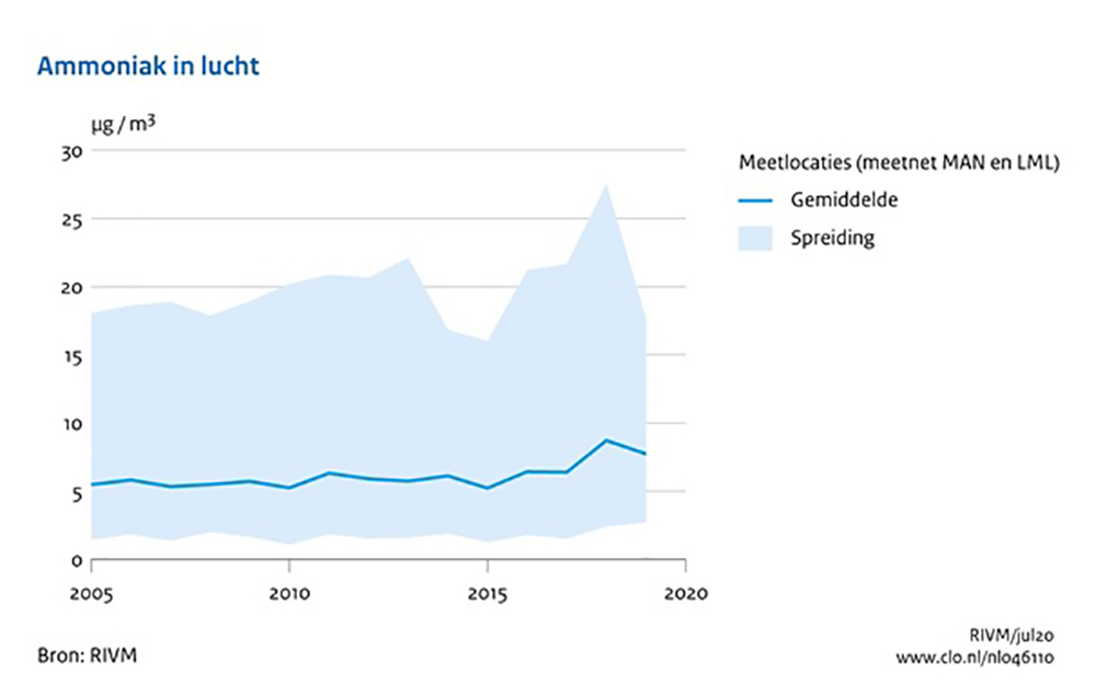 Het RIVM Rijksinstituut voor Volksgezondheid en Milieu meet ammoniak in de lucht in het Meetnet Ammoniak in Natuurgebieden (MAN) en het Landelijk Meetnet Luchtkwaliteit (LML Landelijk Meetnet Luchtkwaliteit ). Het RIVM gebruikt deze metingen om de ontwikkelingen van ammoniak in de tijd te volgen. De gemeten ammoniakconcentraties in de lucht zijn in 2018 ongeveer 35% hoger dan in 2017. Dit komt vooral doordat 2018 extreem warm, zonnig en zeer droog was. Hierdoor kon er veel ammoniak uit mest verdampen die bovendien door het tekort aan regen niet neersloeg.
