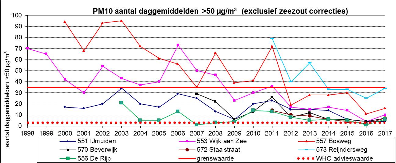 Piekdagen zijn het aantal dagen waarop de fijnstof gemiddeld hoger is dan 50 μg/m3 fijnstof (PM10). Het aantal piekdagen bleef in 2017 voor alle meetstations onder de EU (Europese Unie) grenswaarde PM10 (fijnstof) grenswaarden. In eerdere jaren waren er op sommige plaatsen weleens meer piekdagen (zie grafiek). Ter vergelijking: in Amsterdam waren er in 2017 zes tot twaalf piekdagen voor fijnstof. In de Rijp vijf. Op alle locaties wordt de advieswaarde van de WHO (World Health Organization ) (maximaal 3 piekdagen) overschreden.