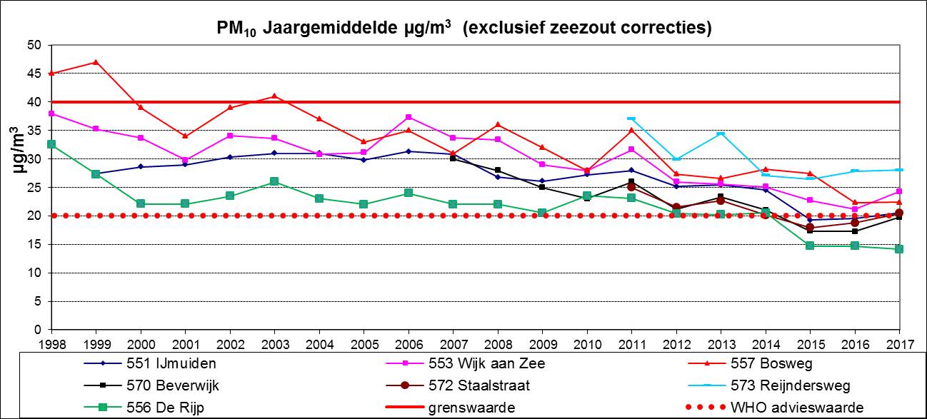 In de IJmond lagen de gemiddelde jaarconcentraties voor PM10 van de verschillende meetstations in 2017 tussen 20 en 28 µg/m3. Ter vergelijking: de gemiddelde fijnstofconcentratie PM10 in druk stedelijk gebied zoals Amsterdam was in 2017 tussen 17 µg/m3 en 25 µg/m3. Afhankelijk van of je in een drukke straat of ergens in een rustige wijk kijkt. In een ‘achtergrondlocatie’ zoals de Rijp was de jaargemiddelde concentratie PM10 14 µg/m3. De Rijp heet een ‘achtergrondlocatie’, omdat er lokaal geen bronnen zoals industrie of veehouderij zijn