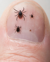 - Volwassen teek (ongeveer 2,5 mm) voedt zich op middelgrote tot grote dieren. Ook mensen.