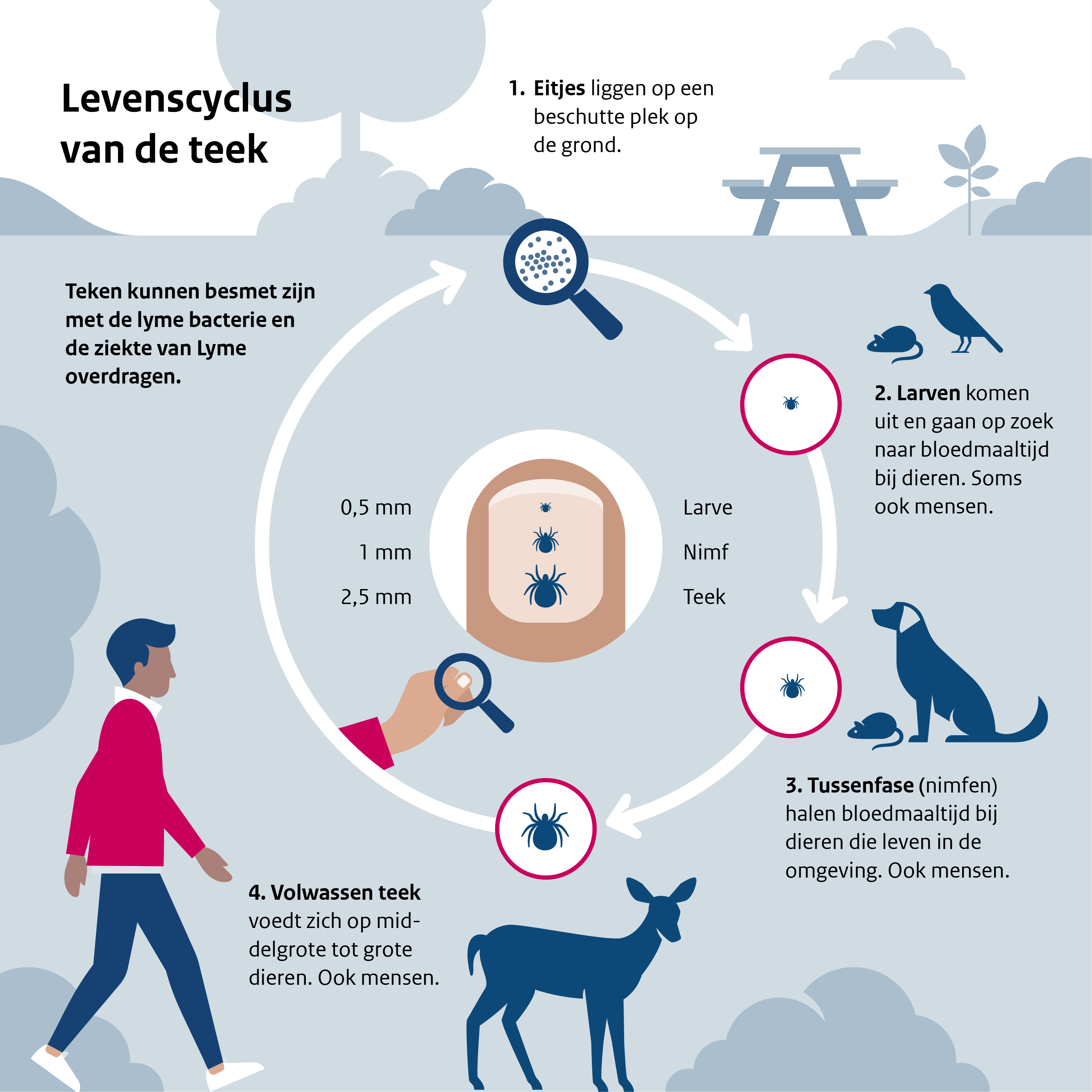 - Larven (ongeveer 0,5 mm) komen uit en gaan op zoek naar bloedmaaltijd bij dieren. Soms ook bij mensen.