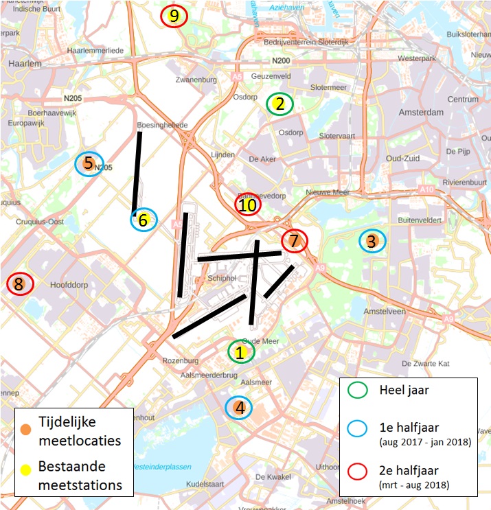De meetcampagne is in augustus 2017 gestart en heeft een jaar geduurd. Op twee locaties is het hele jaar gemeten. Halverwege de meetcampagne is de meetapparatuur van vier locaties verplaatst naar vier andere locaties. Dit maakt het mogelijk om op tien locaties gedurende een half jaar gegevens te verzamelen. De meetlocaties zijn weergegeven in onderstaande kaart: