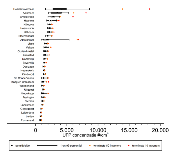 De UFP (ultrafine particles (ultrafijne deeltjes))-verdeling per gemeente in het studiegebied in de periode 2006-2019, gesorteerd naar hoogte van de blootstelling. De linker- en rechterkant van een doos geven het 25- en 75-percentiel aan. Het zwarte bolletje in de doos is de gemiddelde concentratie; de liggende streepjes aan het uiteinde van de horizontale lijnen verbonden aan de doos zijn het 1- en 99-percentiel.