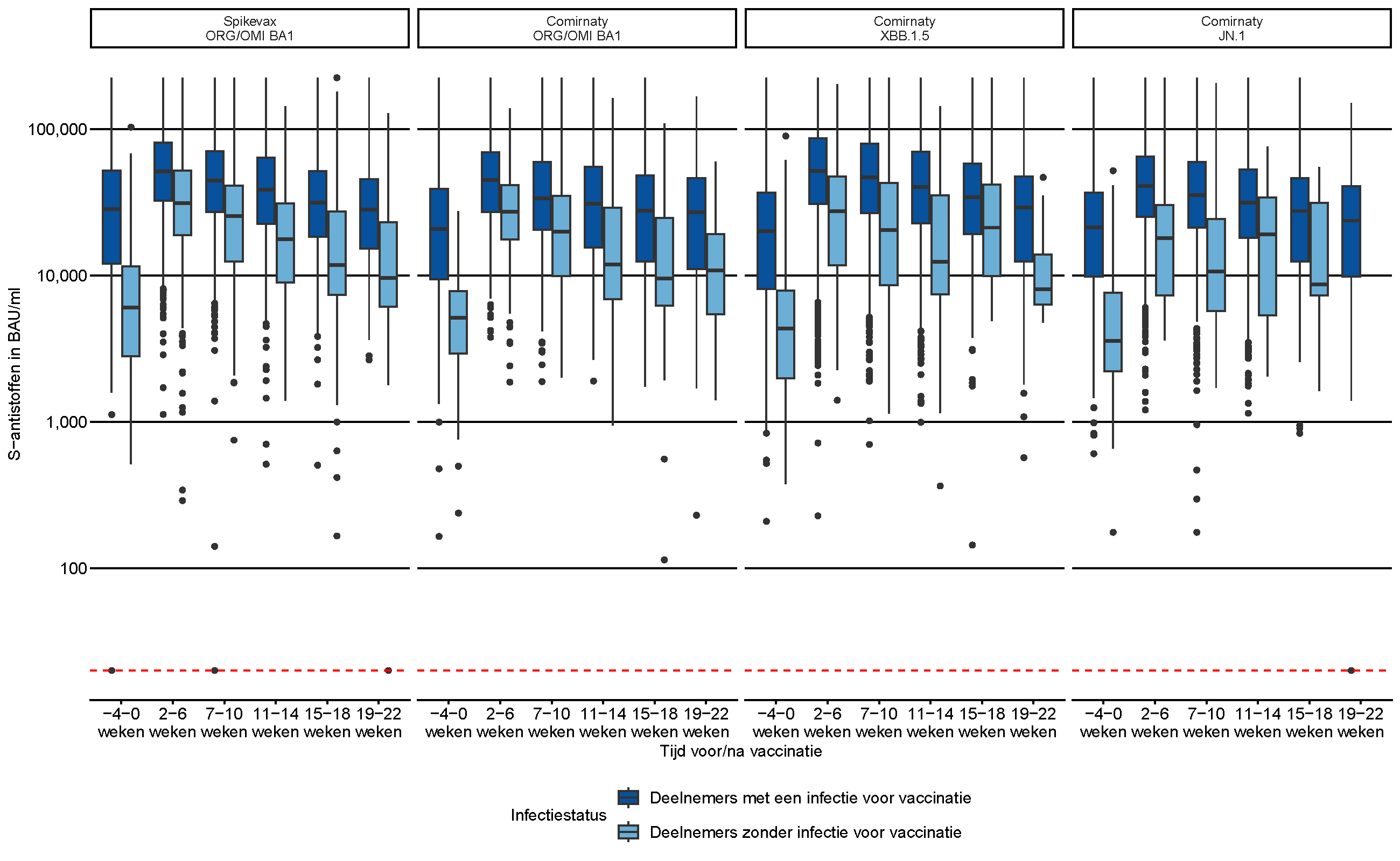 In het najaar van 2022 werd gebruik gemaakt van bivalente vaccins die gebaseerd waren op het originele virus en op de Omicron BA.1 variant. In het najaar van 2023 is een monovalent vaccin gebruikt dat gebaseerd was op de Omicron XBB.1.5 variant. In het najaar van 2024 is een monovalent vaccin gebruikt gebaseerd op de Omicron JN.1 variant. In figuur 2 is per vaccin te zien hoeveel S-antistoffen er aangemaakt werden na vaccinatie. Alle vier de vaccins gaven hoge niveaus van antistoffen. In de 2-6 weken na vaccinatie waren S-antistoffen het hoogst in deelnemers die vóór vaccinatie al een infectie hadden doorgemaakt. De mediane waarde van hun antistofniveau lag tussen de ~41000 en ~52000 BAU/ml. In deelnemers zonder eerdere infectie lag de mediane waarde 2-6 weken na vaccinatie tussen de ~18000 en ~31000 BAU/ml. We zagen geen verschillen tussen deelnemers onder of boven de 60 jaar en tussen deelnemers met of zonder chronische ziekten. Zoals we bij eerdere vaccinaties zagen, neemt de hoeveelheid S-antistoffen af naarmate de vaccinatie langer geleden is.