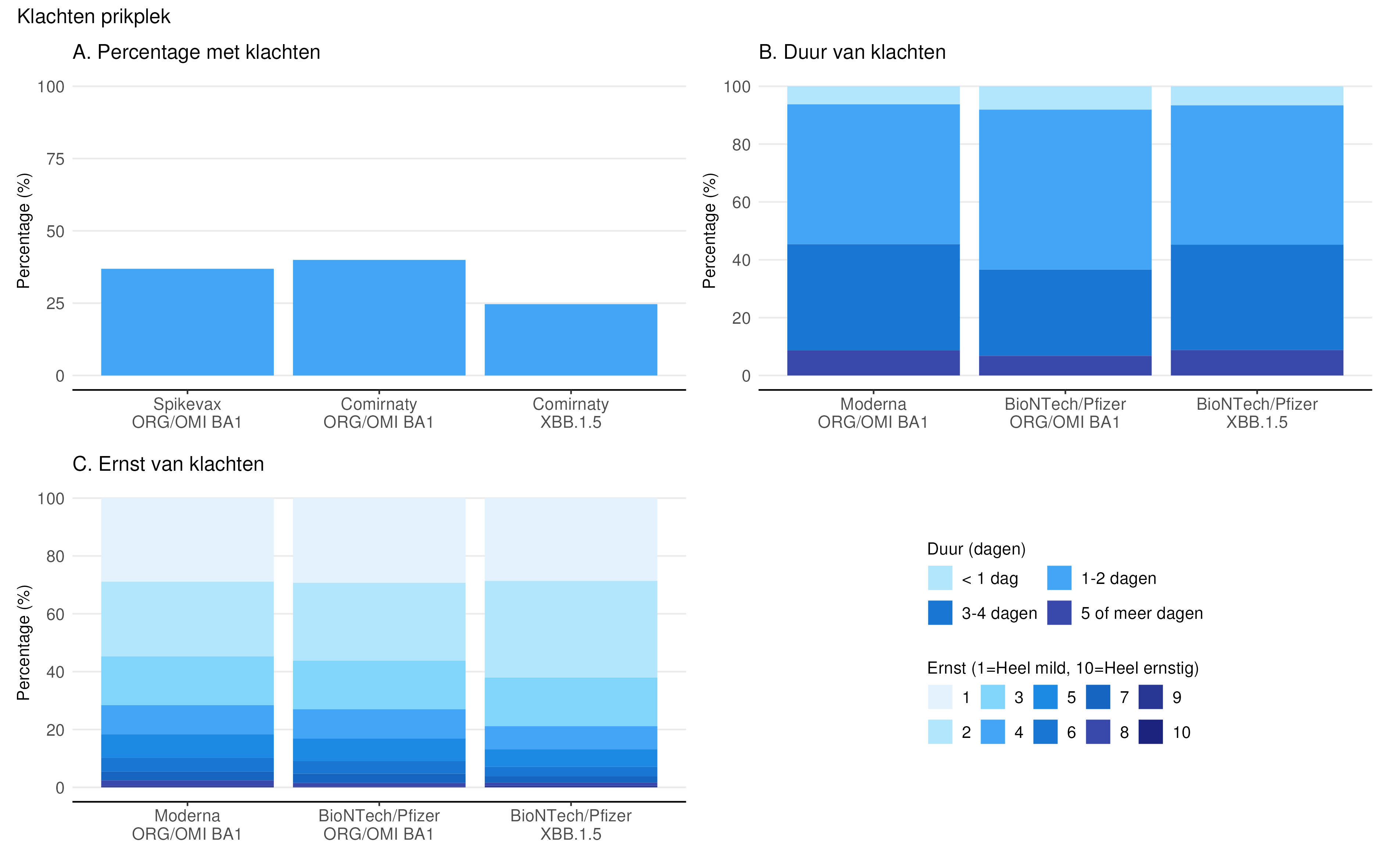 Voor ruim de helft van de deelnemers duurden de klachten rondom de prikplek maximaal 2 dagen. Deelnemers is gevraagd naar de ernst van klachten rondom de prikplek op een schaal van 1 tot 10, waarbij 1 helemaal niet ernstig en 10 heel ernstig is. Meer dan de helft (58%) van de deelnemers schaalde de klachten in op 1 of 2. De bijwerkingen werden als minder ernstig ervaren bij het XBB.1.5 vaccin (62% had een score van 1 of 2), vergeleken met de ORG/OMI BA1 vaccins (bij Spikevax had 55% een score van 1 of 2 en bij Comirnaty 56%).