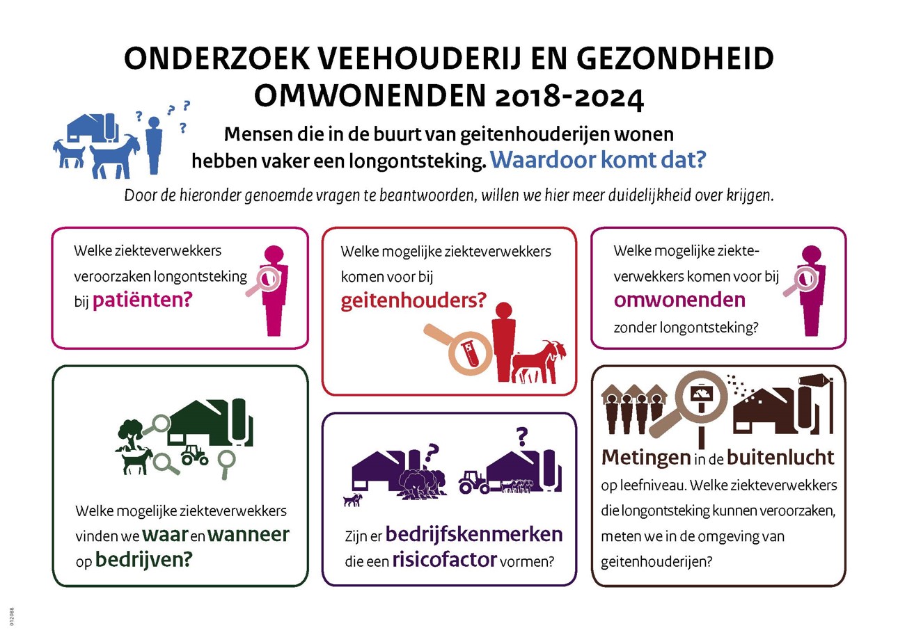 Het programma bestaat uit verschillende onderzoeken. Het eerste onderzoek ‘Intensieve Veehouderij en gezondheid’ richtte zich op de vraag of er ziekten waren die in de omgeving van de veehouderijen vaker voorkwamen dan daarbuiten. Daarna startte het programma Veehouderij en Gezondheid Omwonenden (VGO). Van 2018 tot 2024 liep het laatste onderzoek van het programma Veehouderij en Gezondheid en Omwonenden: VGO (Livestock farming and the health of local residents)-III. Het RIVM, Universiteit Utrecht, Wageningen University en Research en Nivel voerden samen de VGO onderzoeken uit. Op [datum] verscheen het rapport Veehouderij en gezondheid omwonenden (VGO-III) met daarin: actualisatie epidemiologische studies 2014-2019 en de resultaten van het onderzoek naar longontstekingen rond geitenhouderijen 2018-2024