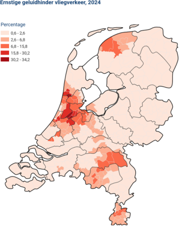 Het RIVM onderzoekt elke vier jaar samen met de (Gemeentelijke Gezondheidsdienst)’en het (Centraal Bureau voor de Statistiek) de gezondheid van de Nederlandse bevolking door middel van de gezondheidsmonitor. In 2024 is in het bijzonder gekeken naar ernstige hinder van vliegverkeer. Op landelijk niveau ervoer 3,4 procent van de volwassenen ernstige geluidshinder door vliegverkeer. In de omgeving van luchthavens ligt dit percentage hoger. Ernstige hinder van geluid van vliegverkeer is dus een lokaal probleem. De figuur hieronder laat per gemeente zien welk percentage inwoners in 2024 ernstige hinder ervaart door vliegtuiggeluid.