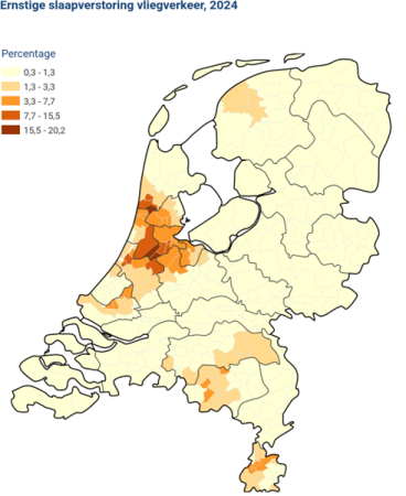 Uit de Gezondheidsmonitor 2024 blijkt dat op landelijk niveau 1,5 procent van de volwassenen (18+) ernstige slaapverstoring van geluid van vliegverkeer ervaart. In gemeenten rond sommige luchthavens liggen deze percentages hoger. De figuur hieronder laat per gemeente zien welk percentage inwoners last had van ernstige slaapverstoring.