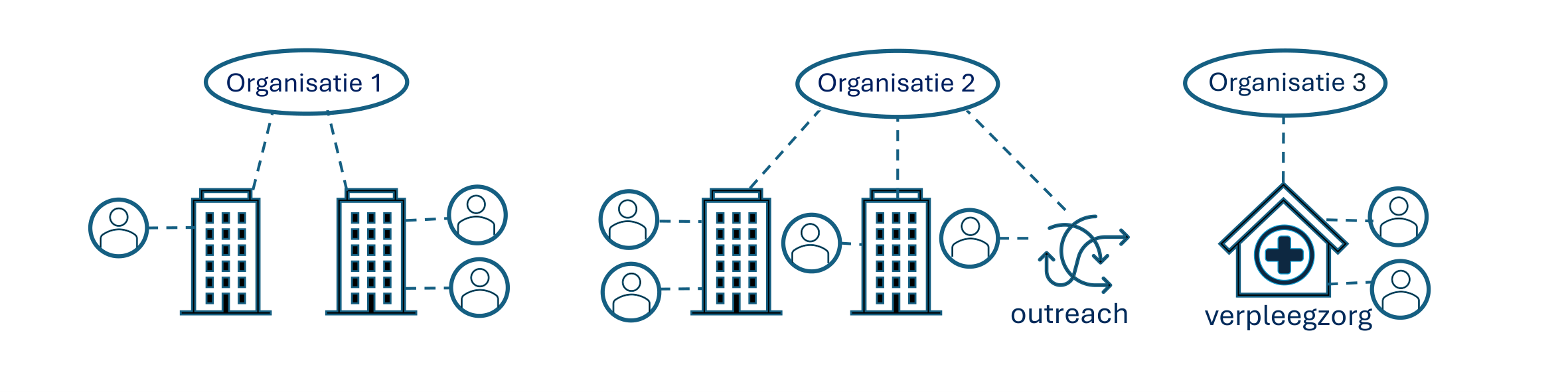 Figuur 1. Schematische weergave van de deelnemers verdeeld over drie verschillende organisaties die bestaan uit meerdere locaties. Het flatgebouwicoon staat voor een normale 24-uurs- of dag- of nachtopvang. Het outreach-team werkt niet op één locatie maar neemt zelf initiatief door mensen op te zoeken en (ongevraagd) hulp en diensten aan te bieden. Verpleegzorg biedt medische en verpleegkundige zorg en begeleiding aan mensen die dak- en thuisloos zijn.