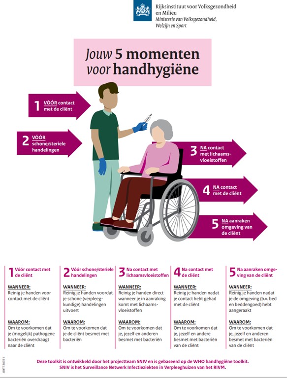 - Wanneer: Reinig je handen voordat je schone (verpleegkundige) handelingen uitvoert.