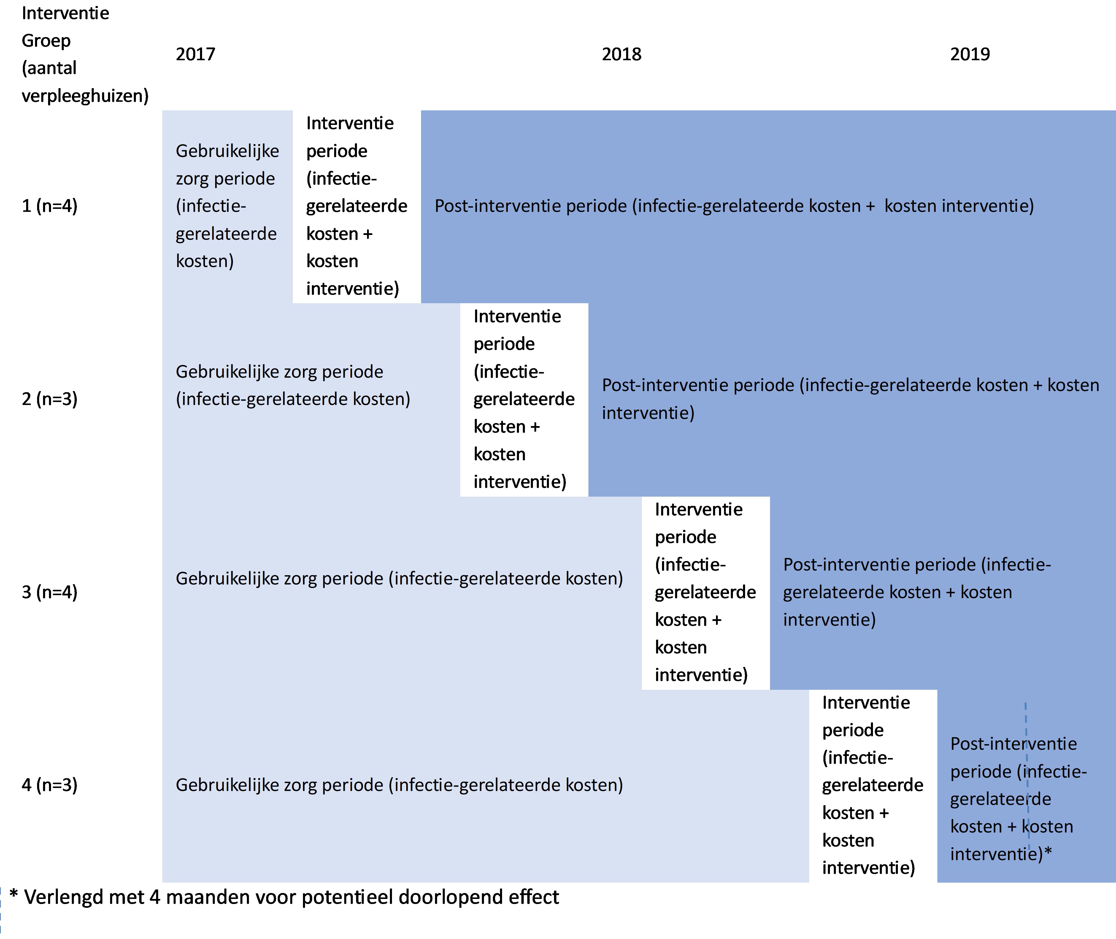 Om de effectiviteit van de zorgvuldig ontwikkelde, op maat gemaakte verbeterstrategie voor de naleving van handhygiëne door zorgprofessionals in verpleeghuizen te testen, hebben we een stepped-wedge cluster-randomized controlled trial uitgevoerd. We hebben voor dit ontwerp gekozen, omdat in een stepped-wedge-ontwerp alle instellingen die meedoen aan het onderzoek uiteindelijk de verbeterstrategie ontvangen. Na het in kaart brengen van de huidige situatie kreeg de eerste groep met verpleeghuizen (n=4) de interventie aangeboden. Daarna werd in alle verpleeghuizen (n=14), ook de verpleeghuizen die nog geen interventie hadden ontvangen (n=10), weer de naleving van handhygiëne gemeten. Na die meetperiode kreeg de tweede groep verpleeghuizen (n=3) de interventie aangeboden, en werd daarna weer in alle verpleeghuizen de handhygiënenaleving gemeten. Dat ging zo door tot alle verpleeghuizen de interventie hadden ontvangen en er een eindmeting van de naleving van handhygiëne had plaatsgevonden.