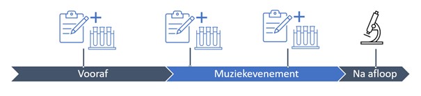 De afname van de swabs vond plaats op drie momenten: de dag voor het evenement, in de middag van het evenement (zo’n 1-4 uur na start evenement) en aan het begin van de avond (zie figuur 1). De metingen werden uitgevoerd door een deskundige infectiepreventie, volgens een gestructureerd protocol. In totaal werden 240 swabs afgenomen (120 per evenement). De kranen werden gemarkeerd op een plattegrond en aanvullende gegevens over de omstandigheden, waterbron, hygiëne, schoonmaak en de functionaliteit van de kranen werden genoteerd. Ook werd informatie over de weersomstandigheden en andere evenementkenmerken verzameld. Zie de tabel in de bijlage voor meer informatie over de kranen en de omstandigheden van de metingen.