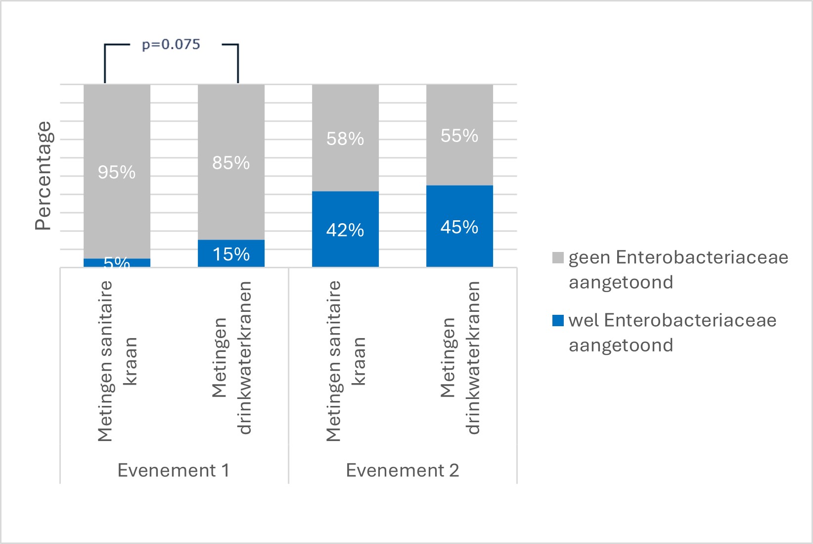 Er werd geen significant verschil gevonden tussen de aanwezigheid van Enterobacteriaceae op sanitaire kranen en drinkwaterkranen bij beide evenementen. Op evenement 1 werd een trend gezien richting vaker fecale contaminatie bij drinkwaterkranen (15% ten opzichte van 5%; p=0.075).