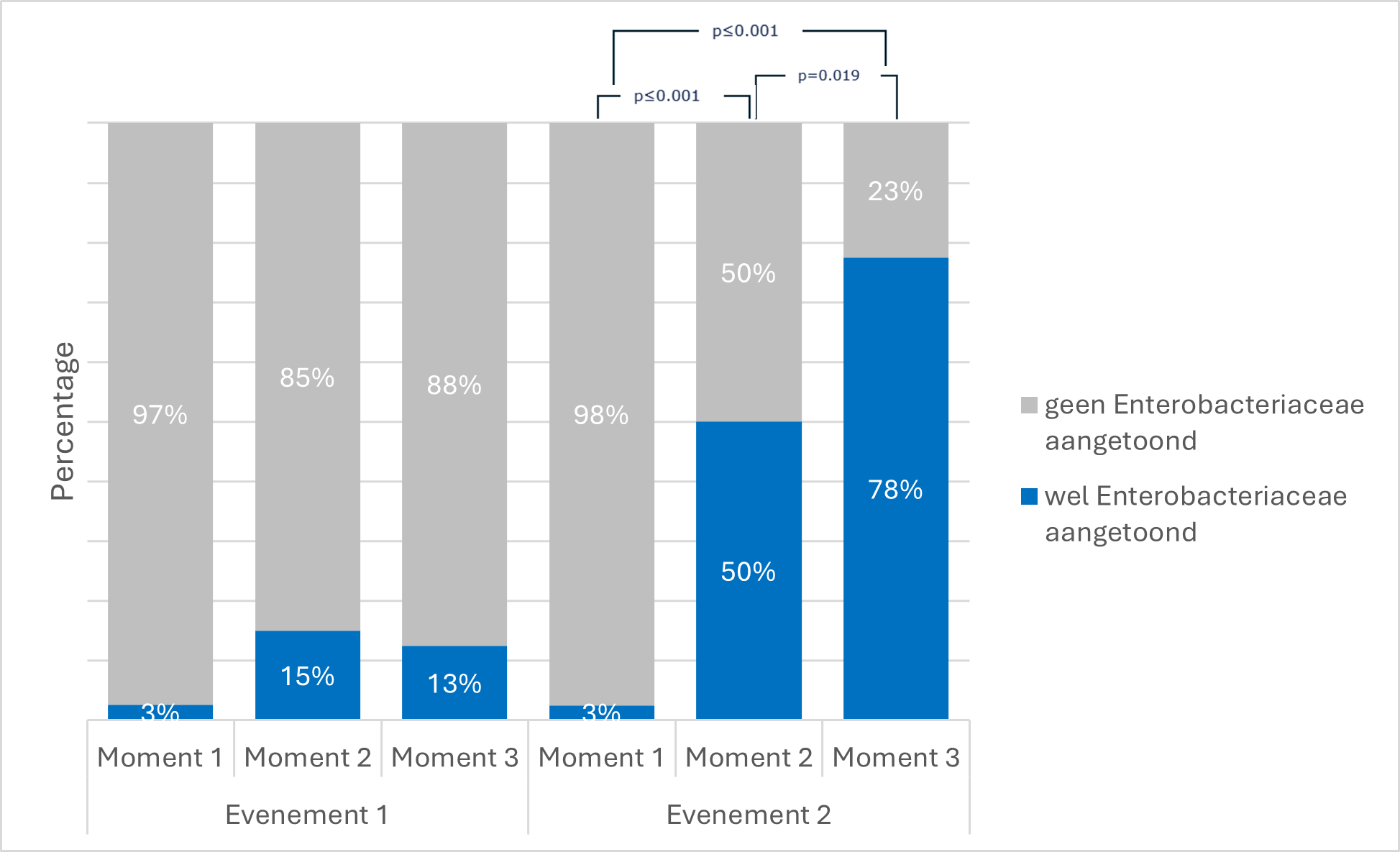 Bij evenement 2 was de toename van aangetoonde Enterobacteriaceae significant (p≤0.001), met percentages van 3% (1 van de 40) bij metingen moment 1, oplopend tot 50% (20 van de 40) bij moment 2 en 78% (31 van de 40) bij moment 3. Post-hoc analyses toonden significante verschillen tussen alle momenten (p ≤ 0.02). Er werd ook onderzocht of contaminatie op meetmoment 2 dezelfde plekken betrof als op meetmoment 3. Hieruit bleek dat op 3 van de 20 plekken waar Enterobacteriaceae op moment 2 werden aangetoond, dit op moment 3 niet meer werd gevonden. Maar bij het overgrote deel van de plekken (17 van de 20) werden Enterobacteriaceae zowel op moment 2 als 3 aangetoond.