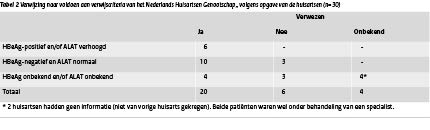 Ruim twee derde van de patiënten (22) was onder behandeling van een specialist of onder behandeling geweest. Tabel 2 geeft weer, op basis van de informatie van de huisartsen, hoeveel personen verwezen zijn die wel of niet voldeden aan de daarvoor geldende criteria van de NHG-standaard ( HBeAg (hepatitis B-e-antigeen)-positief en/of ALAT verhoogd).(5) Tien van de 30 patiënten waren door de huisarts verwezen hoewel er volgens de NHG-richtlijn geen indicatie voor was.