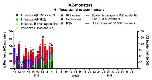 Figuur 1. Incidentie van influenza-achtig ziektebeeld (IAZ) en laboratoriumuitslagen van monsters van patiënten met IAZ bij de huisarts, Nederland, week 40 2018 – week 4 2019