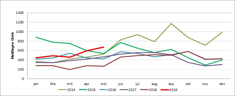 Figuur 1. Aantal kinkhoestmeldingen per maand, 2014 - mei 2019 (Bron: Osiris-AIZ)