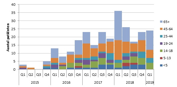 Figuur 4. Aantal patiënten met meningokokkenziekte serogroep W per kwartaal naar leeftijdsgroep januari 2015 t/m maart 2019