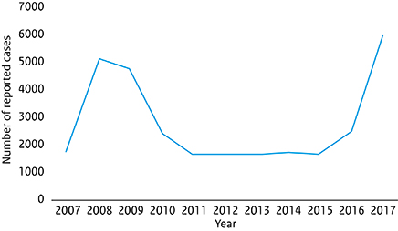 Figuur 2. Aantal gerapporteerde hepatitis A-patienten per jaar, periode 2007 – 2017 in 14 EU-landen waarvan data beschikbaar zijn