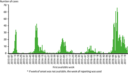 Figuur 3. Gemelde patiënten met een influenza A(H7N9)-infectie in China per week, januari 2013 – juni 2017
