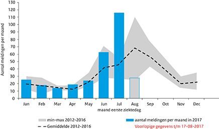 In 2017 zijn 115 legionellosemeldingen geregistreerd met een eerste ziektedag in juli. 84% van deze patiënten heeft de infectie waarschijnlijk binnen Nederland opgelopen. Dit is het hoogste aantal meldingen in een julimaand sinds de landelijke registratie. Alleen in augustus 2006 (120 meldingen) en in augustus en september 2010 (respectievelijk 137 en 118 meldingen) waren er meer meldingen binnen 1 maand (Figuur 1). Er zijn nu 28 meldingen met een eerste ziektedag in augustus. Er is 1 geografisch cluster van 4 patiënten die binnen hetzelfde postcodegebied wonen, met allen een eerste ziektedag binnen dezelfde periode van 2 weken. De betrokken GGD (Gemeentelijke Gezondheidsdienst) onderzoekt dit cluster. Tot dusver is de bron niet gevonden. Er zijn geen natte koeltorens in de directe omgeving bekend. Buiten dit cluster zijn de andere gemelde legionellapatiënten afkomstig uit verschillende delen van het land en wordt er geen clustering gezien. (Bron: RIVM)