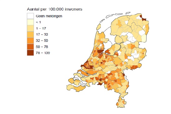 Figuur 2. Aantal bij de GGD’en gemelde COVID-19-patiënten per 100.000 inwoners per gemeente met GGD-meldingsdatum van 18 augustus t/m 1 september 10:00 uur. De donkergrijze lijnen geven de grenzen van de GGD-regio’s weer. (Bron: RIVM)