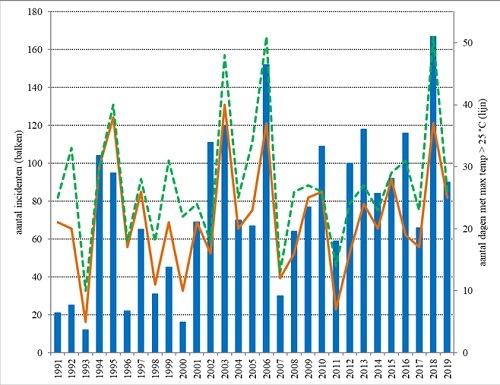 Figuur 1. Aantal incidenten en aantal zomerse dagen per jaar voor de periode 1991-2019. Het aantal incidenten wordt weergegeven met de zwarte balken. De gestippelde lijn geeft het aantal zomerse dagen in het badseizoen (mei – september) weer, de vaste lijn het aantal zomerse dagen in de zomer (juni, juli, en augustus).