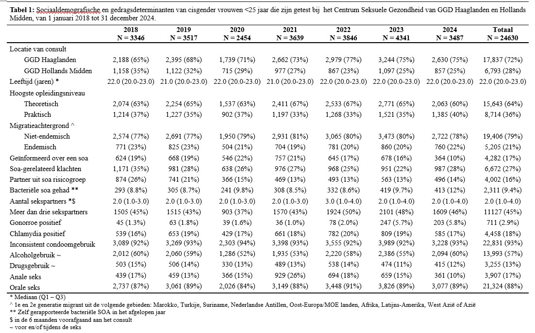 Tabel 1: Sociaaldemografische en gedragsdeterminanten van cisgender vrouwen <25 jaar die zijn getest bij het Centrum Seksuele Gezondheid van GGD Haaglanden en Hollands Midden, van 1 januari 2018 tot 31 december 2024.