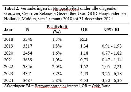 Tabel 2. Veranderingen in Ng positiviteit onder alle cisgender vrouwen, Centrum Seksuele Gezondheid van GGD Haaglanden en Hollands Midden, van 1 januari 2018 tot 31 december 2024.