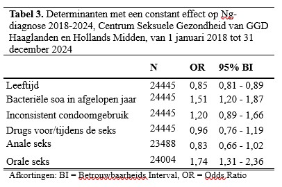 Tabel 3. Determinanten met een constant effect op Ng-diagnose 2018-2024, Centrum Seksuele Gezondheid van GGD Haaglanden en Hollands Midden, van 1 januari 2018 tot 31 december 2024