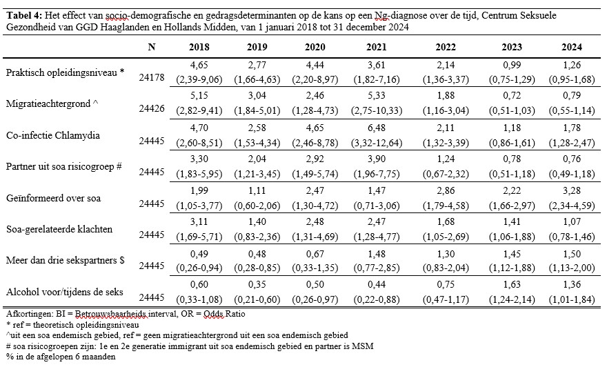 Tabel 4: Het effect van socio-demografische en gedragsdeterminanten op de kans op een Ng-diagnose over de tijd, Centrum Seksuele Gezondheid van GGD Haaglanden en Hollands Midden, van 1 januari 2018 tot 31 december 2024