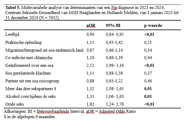 Uit de univariabele analyse voor 2023–2024 kwamen de volgende factoren naar voren voor opname in het multivariabele model: leeftijd, migratieachtergrond uit een soa-endemisch gebied, co-infectie met Ct, door een sekspartner geïnformeerd zijn over een soa, soa-gerelateerde klachten, een partner uit een soa-risicogroep, meer dan drie sekspartners, alcoholgebruik voor en/of tijdens seks, en orale seks. Na correctie bleven vijf factoren significant geassocieerd met Ng (zie Tabel 5):