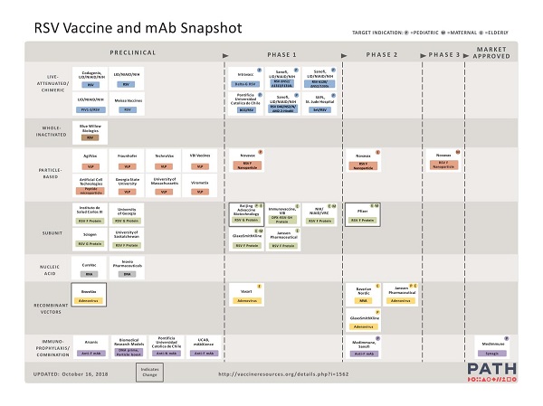 Figuur 3. Overzicht van de ontwikkelingen in vaccins en immunoglobulinen tegen respiratoir syncytieel virus (https://vaccineresources.org/details.php?i=1562)